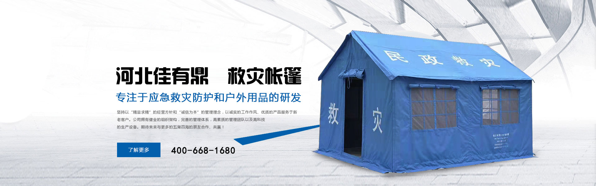 河北佳有鼎科技有限公司原為北京五環(huán)精誠(chéng)帳篷有限責(zé)任公司多年來(lái)專(zhuān)注于應(yīng)急救災(zāi)防護(hù)和戶(hù)外用品的研發(fā),是一家集研發(fā)、設(shè)計(jì)、生產(chǎn)、銷(xiāo)售、服務(wù)于一體的綜合型公司。